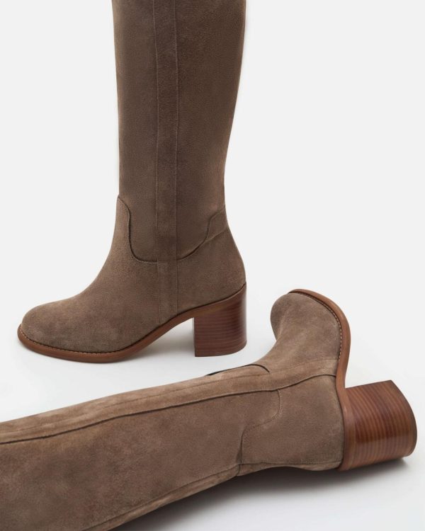 Craquez pour les bottes RANCH en cuir taupe, parfaites pour un style bohème chic. Leur finition velours et leur allure élancée subliment vos looks, que vous les portiez avec une jupe fluide ou un pantalon ample. Fabriquées en Italie, elles combinent élégance et confort.