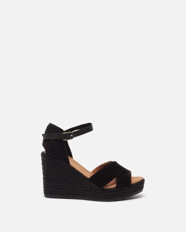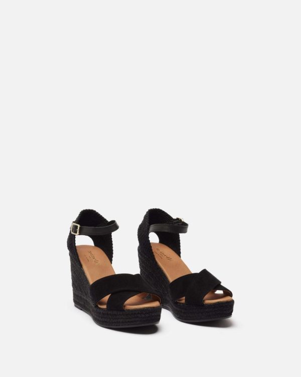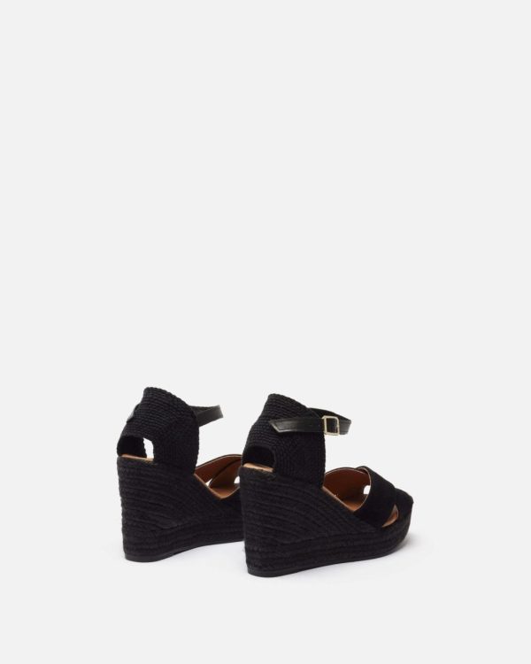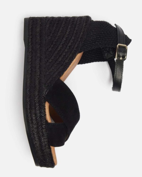 Les compensées Carine en cuir vachette noir, fabriquées en Espagne, avec une semelle en gomme, offrent un talon de 10 cm pour allonger la silhouette avec confort. Leur doublure en cuir porc garantit un confort optimal, parfaites pour une allure chic et élégante.