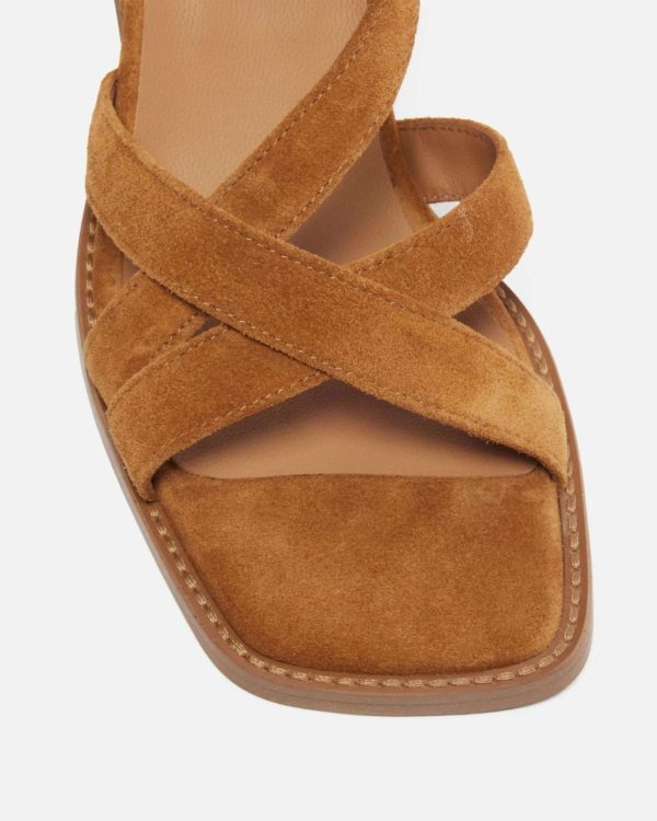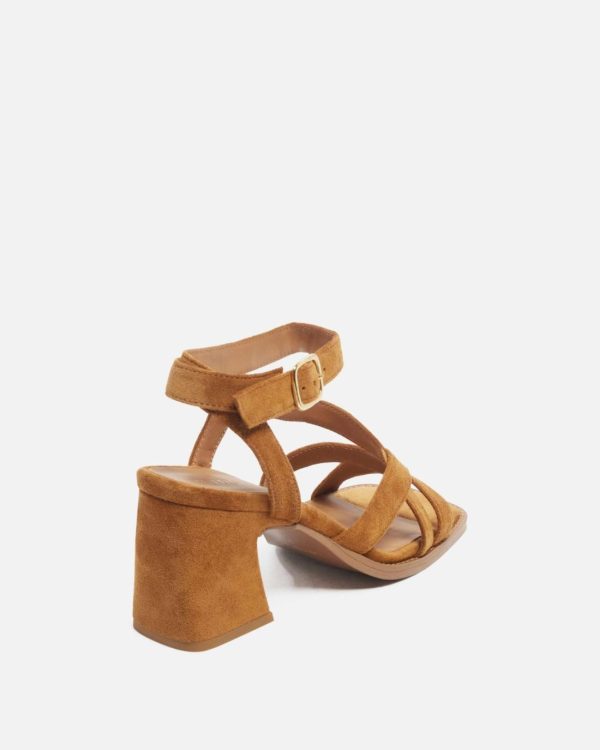 Les sandales à talons Malori en cuir velours cognac allient élégance et confort avec leur talon de 6 cm. Fabriquées au Portugal, elles présentent une semelle en tunit pour une meilleure durabilité. Idéales avec une robe habillée ou un jean pour une touche chic au quotidien.